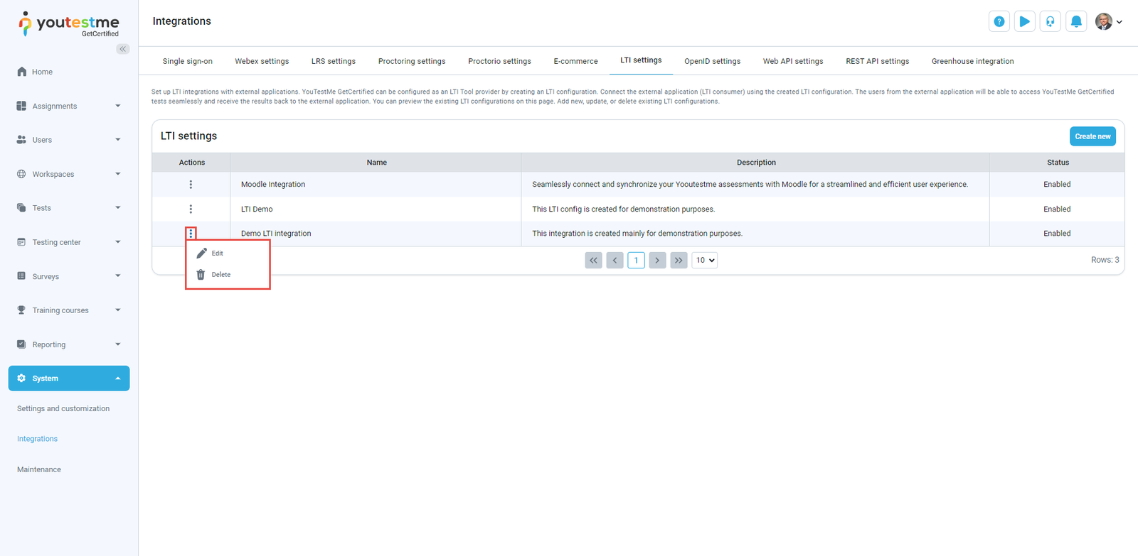 When the LTI integration is created, you can choose from the Actions column options to edit or remove the integration.