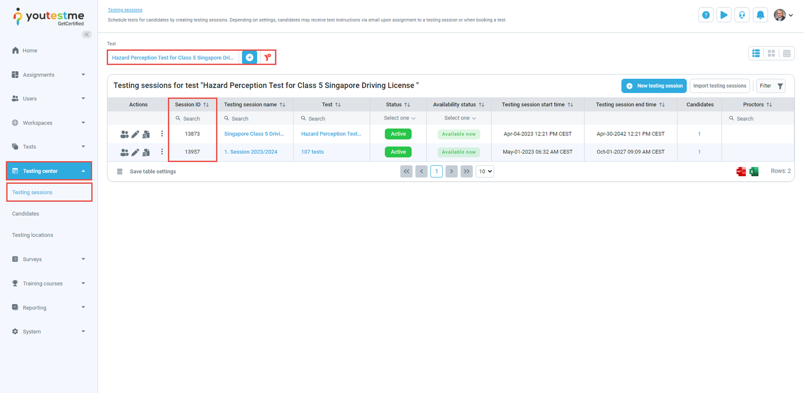 - In the Custom parameters field, enter custom_testing_session_id and the ID of the testing session in which the candidates need to take the test. To find the testing sessions ID in the YouTestMe GetCertified application, select the Testing center/Testing sessions tab and the desired test.