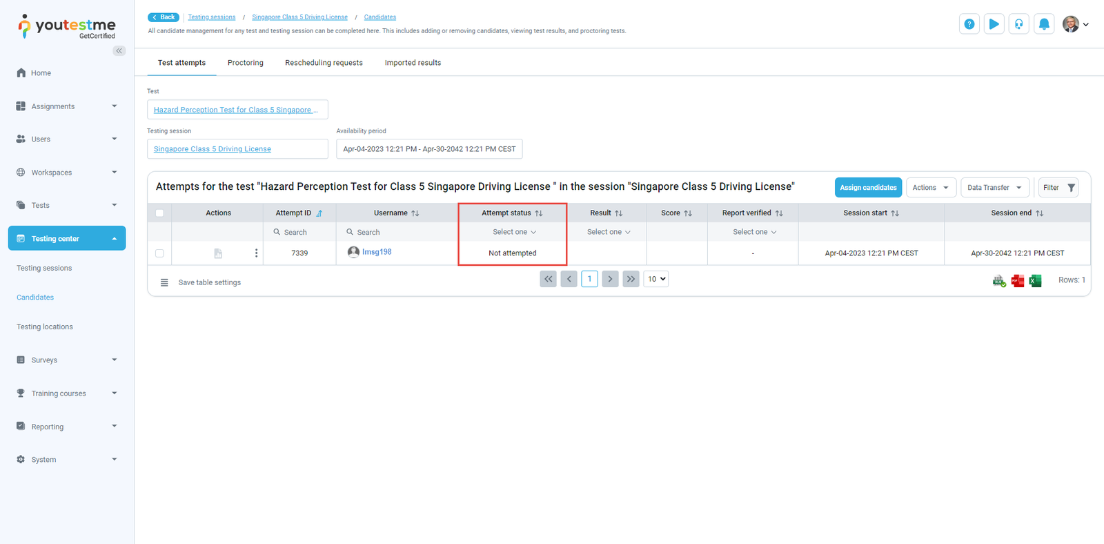 - Test attempts must have Not attempted or Ready to continue status.