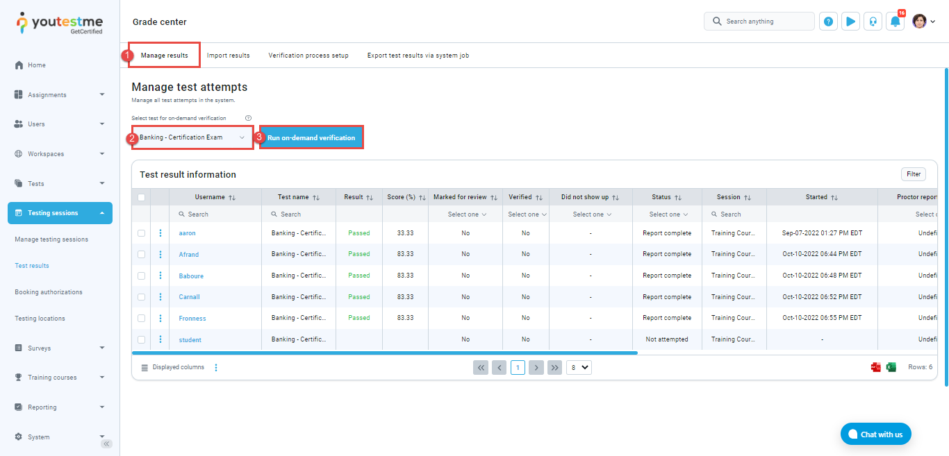 The Manage Results dashboard displays a table with all test attempts within the system, providing detailed information about each attempt. This enables managers to quickly access and review information related to test attempts, such as scores, completion times, verification status, test attempt status, and other relevant details.