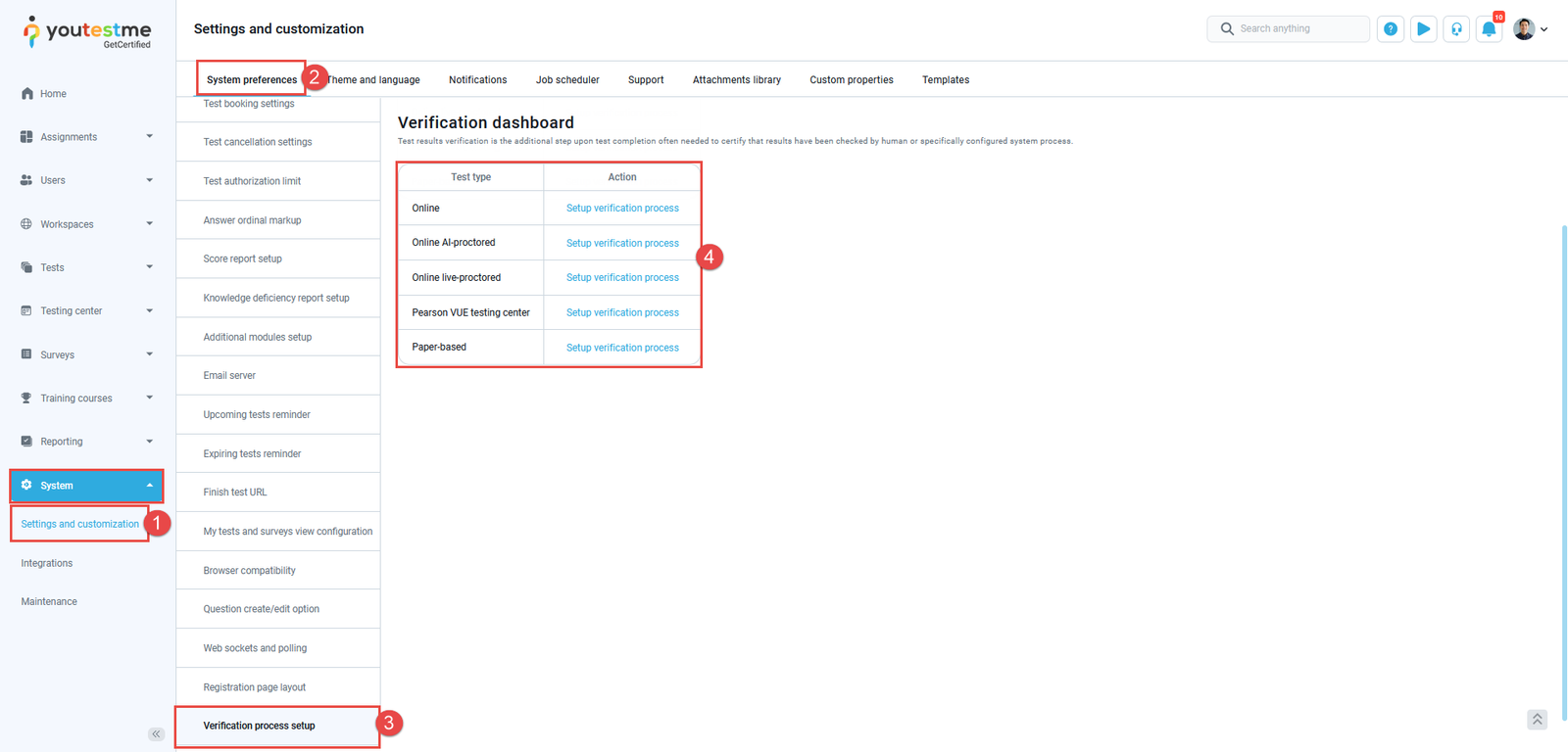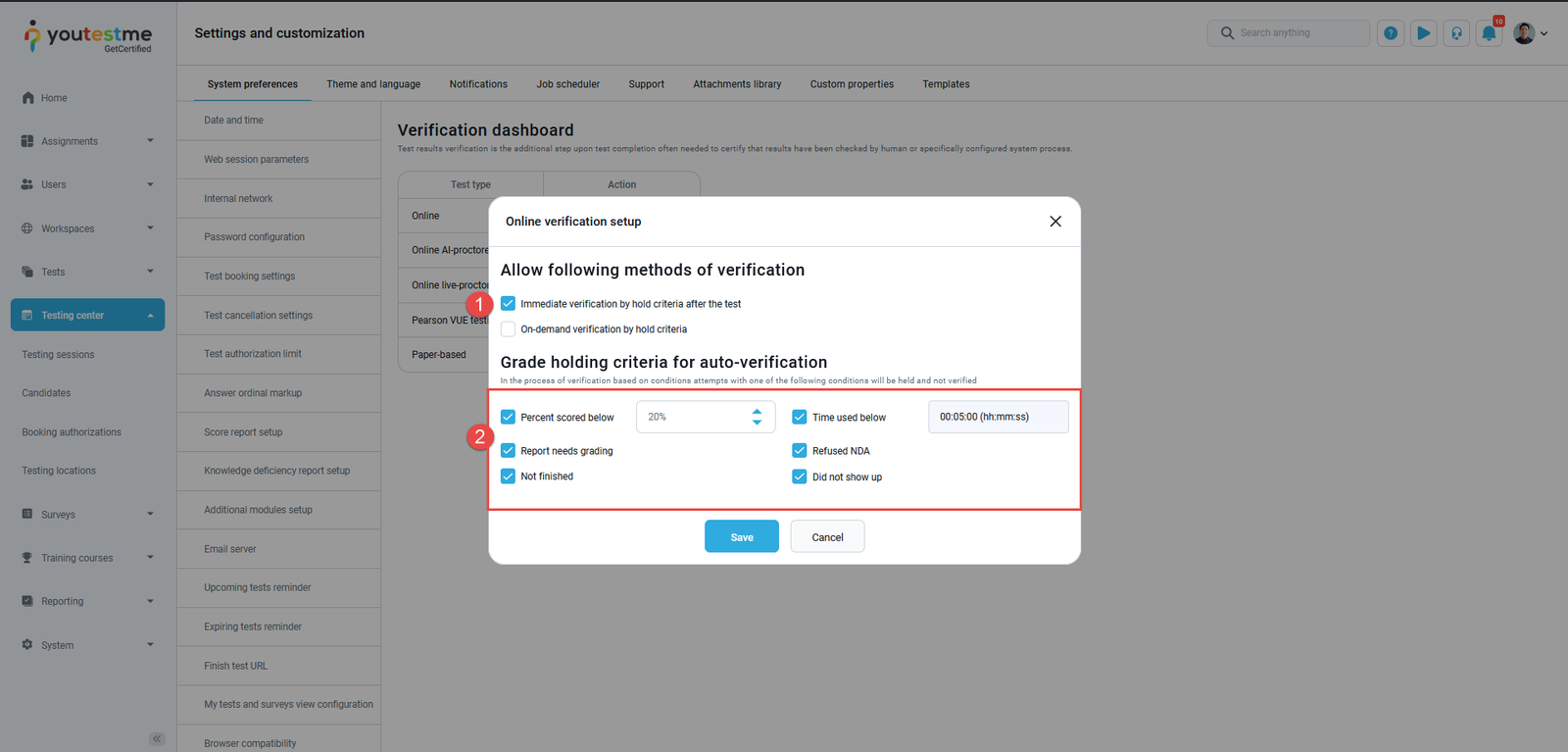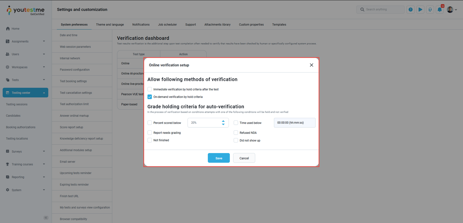 Test type – Configure verification based on the delivery preference, whether online, paper-based, or other. You can also specify the preferred delivery method, such as online or paper-based.