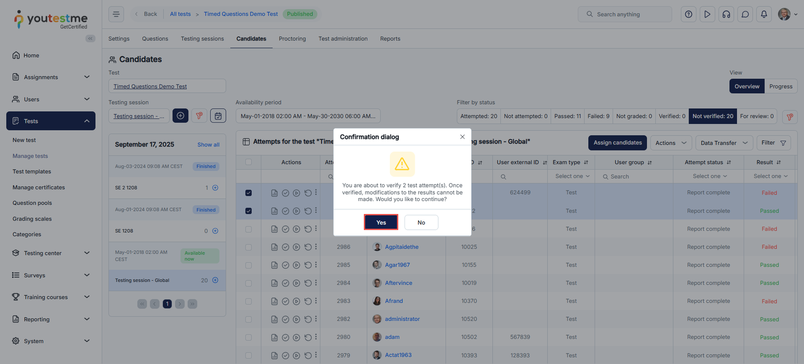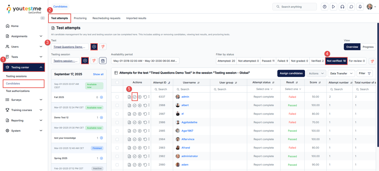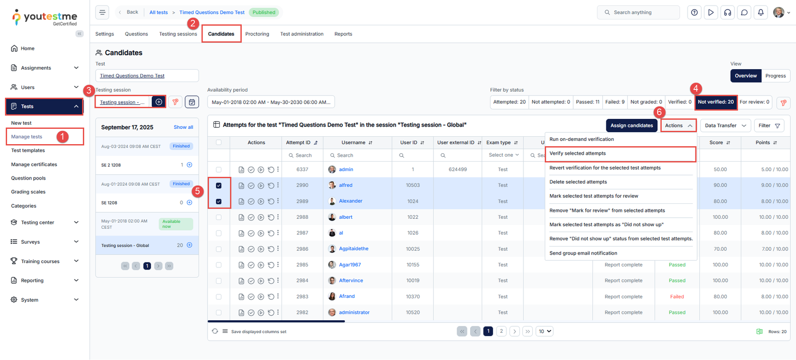 - To bulk verify multiple attempts, select the checkboxes next to the usernames of the candidates you wish to verify.