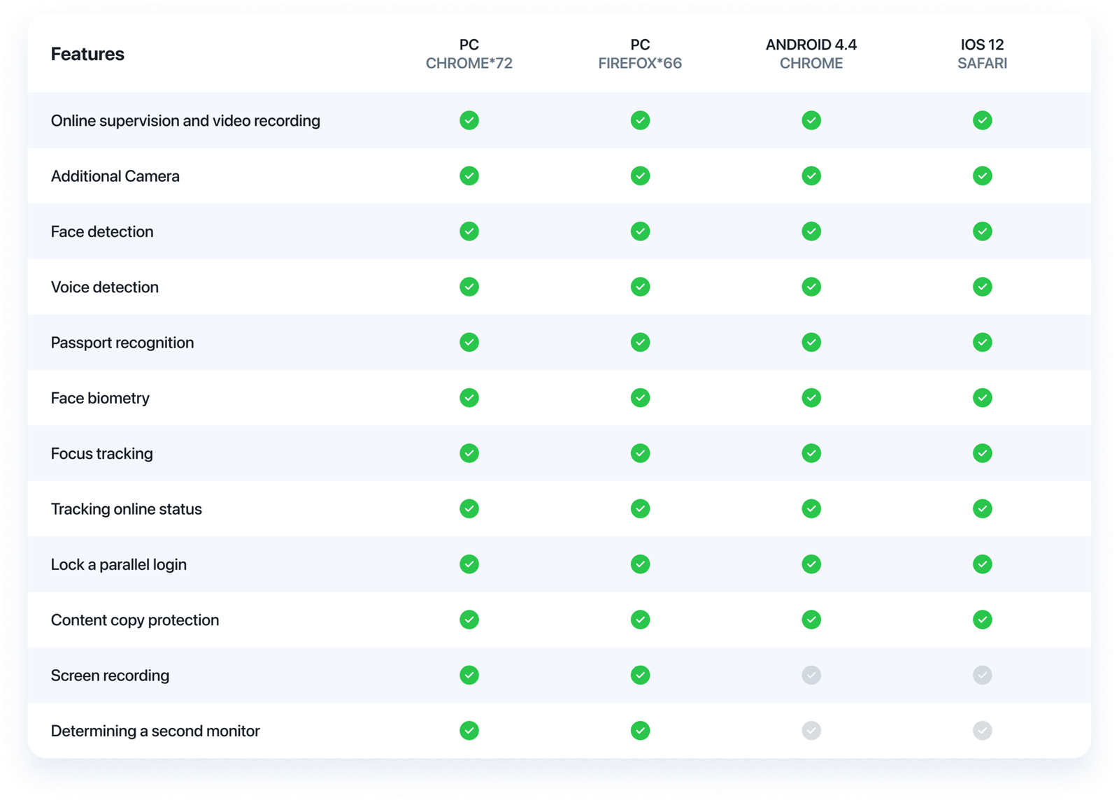 Candidates are monitored via web camera during the whole test-taking process. All their screen activities are recorded, and any suspicious behavior is flagged using behavioral trackers. Artificial intelligence technology marks moments when there are multiple or unauthorized faces in front of the camera, background noise, changing focus to another window, and many more. If there is a violation, the system will automatically lock the screen to prevent unauthorized access. After the exam is over, the system generates the credibility report, i.e., proctoring report containing the score and assessment of candidates' behavior.