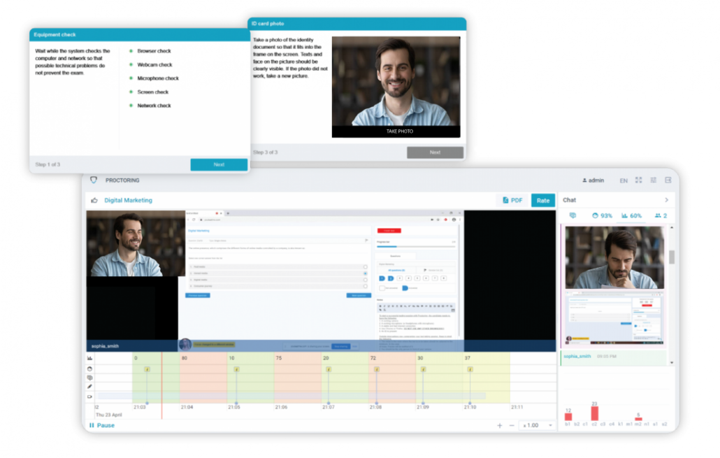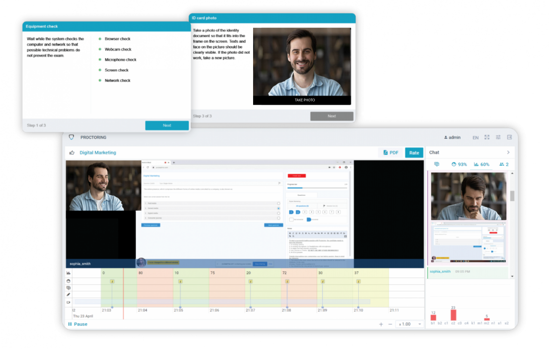 Before the exam starts, automated software conducts the equipment check, i.e., ensures the candidate is sharing a screen with video and audio recording.