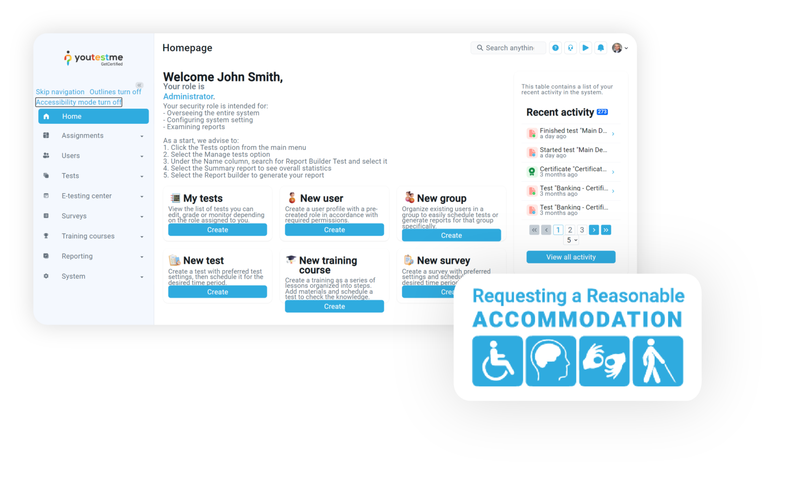 YouTestMe GetCertified software is designed to be user-friendly, easy to navigate, and accessible to users with disabilities. Our platform ensures compatibility with assistive technologies such as screen readers, provides alternative text for images, and maintains navigable and understandable forms.