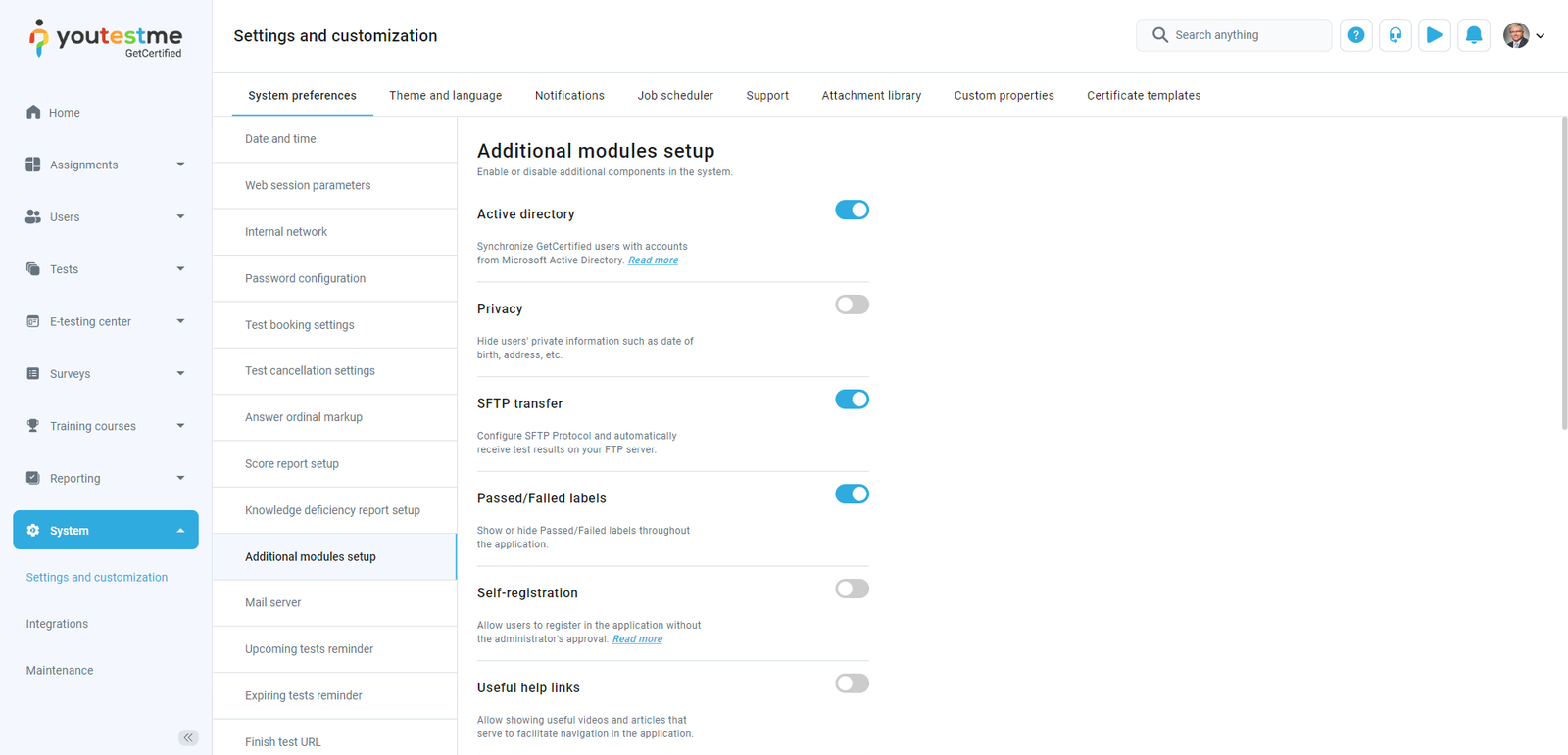 Enabling additional modules (privacy option, the preview of result labels, self-registration option)